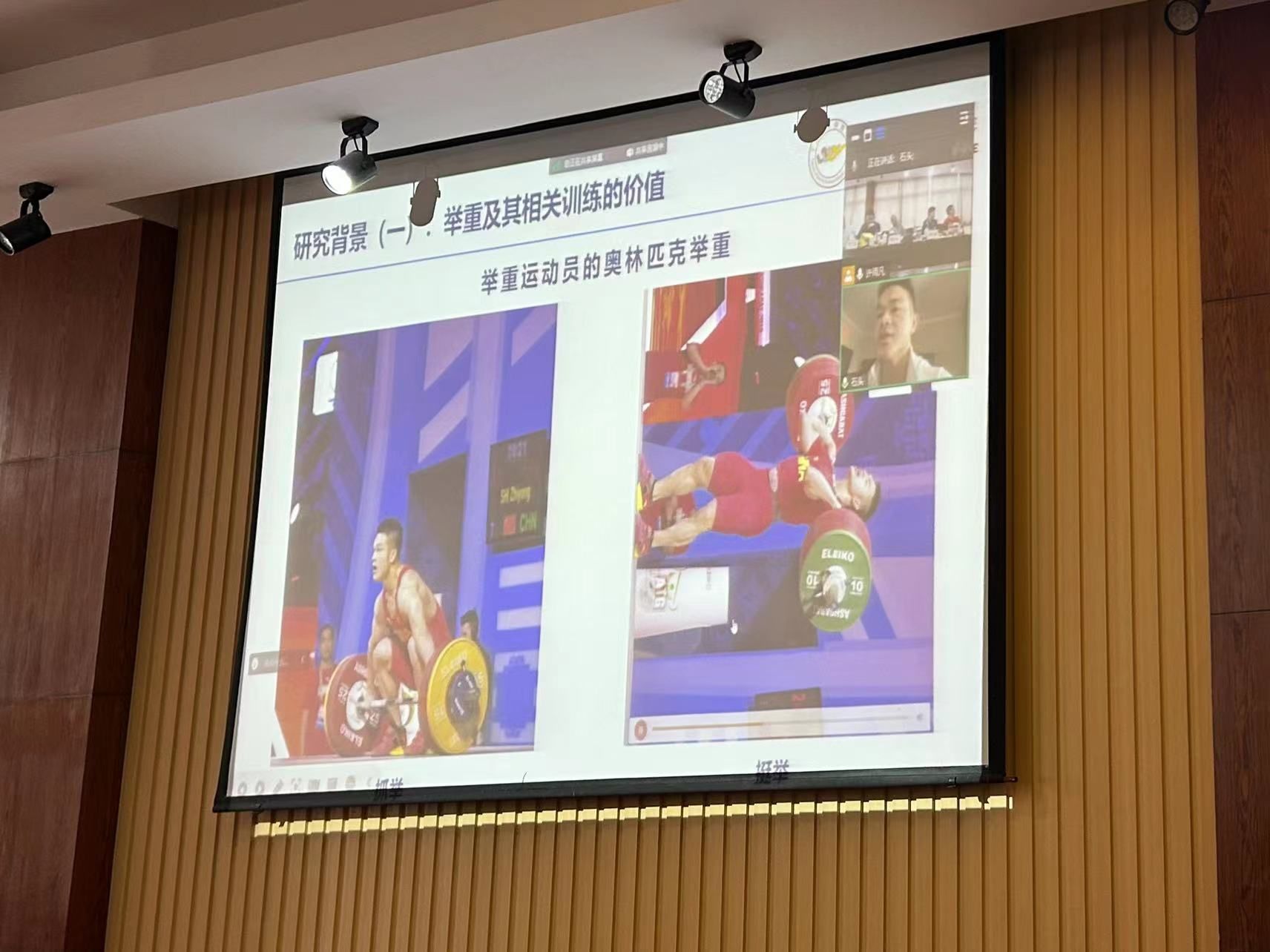 第三位报告人:2022级博士研究生石智勇,答辩题目《为运动生物力学视角下大众健身人群个性化举重训练退阶方案的开发与效果评估》,因参加2023年国际举联卡塔尔大奖赛,报告人石智勇采用线上报告的形式进行。