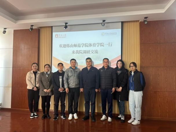 近日,韩山师范学院体育学院院长刘会成一行来我院调研交流。宁波大学体育学院教学副院长赵亮、运动训练专业系主任龚镇、副主任张妍,教务办主任华颖出席会议,会议由赵亮主持。