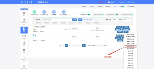 4. 进入项目组成员,请确认成员是否完整。特别是项目中有学生的参与的,请完善学生身份类别。成员信息有问题的,进入科研系统AV解说,左侧的项目界面,点击操作下拉框下的成员调整申请,进入成员调整界面进行添加和修改,待项目主管审核之后,会自动补充到项目经费公开一览表,最后再提交即可。