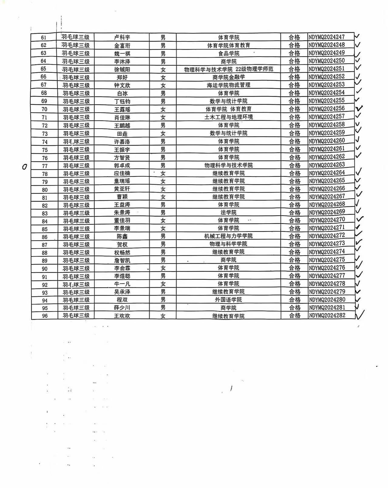 根据国家体育总局《体育竞赛裁判员管理办法》《浙江省体育竞赛裁判员管理实施细则》和《关于浙江省高等学校等级裁判员项目审批管理实施办法》的规定,按照相应项目三级裁判员技术等级标准,完成所授课学时,考试合格,现对蒋安琪等96人拟晋级羽毛球三级裁判员进行公示。公示期为发布之日起 5 个工作日。在公示期内,任何单位和个人均可通过来信、来电、来访的方式反映公示对象情况,信件有效期以邮戳为准。以单位名义反映问题的应加盖公章。以个人名义反映问题的提倡署报本人真实姓名和联系电话。反映问题要坚持实事求是的原则,反对借机诽谤诬告。
