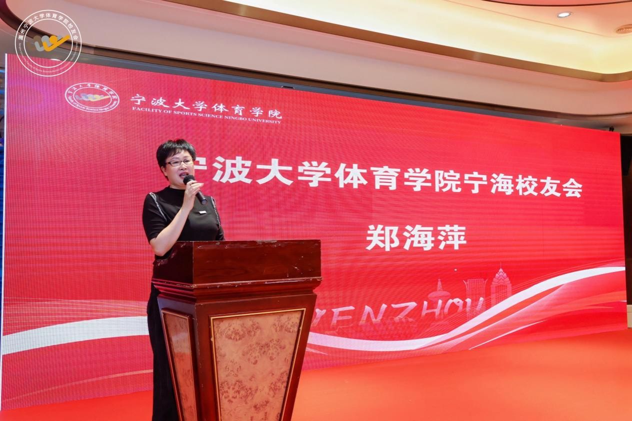 宁波大学体育学院宁海校友会会长郑海萍校友代表兄弟校友会表示祝贺,并分享办会经验,希望可以同频同道共发展,为母校的繁荣添砖加瓦。