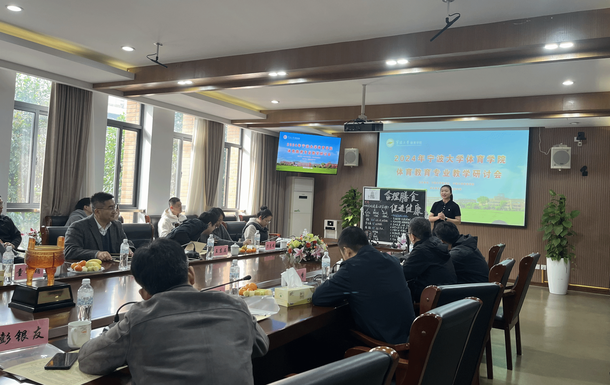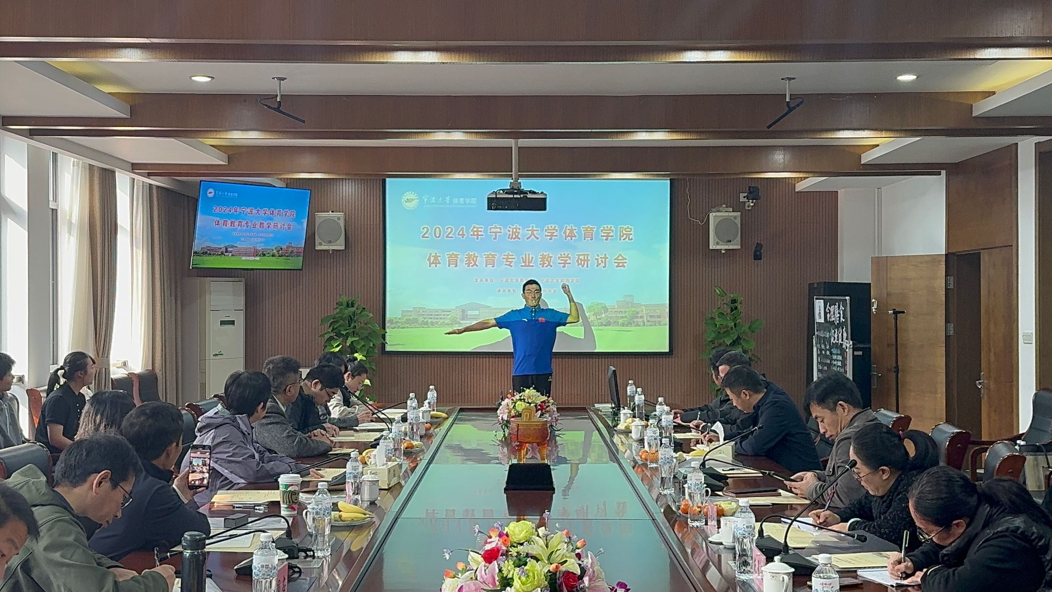 会议由赵亮副院长主持,鄞州中学党委书记王仕杰首先致辞。王书记向与会代表简要介绍了鄞州中学的悠久校史和体育教育工作的成效。随后,宁波大学体育学院党委书记童莹娟围绕宁波大学及体育教育专业的特色和优势进行了深入介绍,特别是学科在全国的排名与学生荣誉成果。她还就当前教育改革和社会发展对体育教师的要求提出了新思考,向各实习单位表达了真挚谢意。
