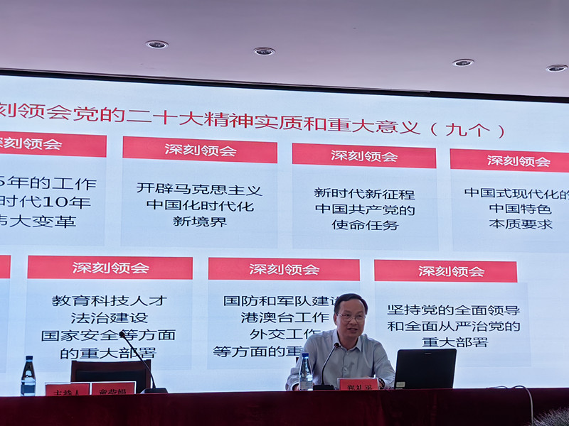 党的二十大是在全党全国各族人民迈上全面建设社会主义现代化国家新征程、向第二个百年奋斗目标进军的关键时刻召开的一次十分重要的大会。郑礼平老师首先从世界百年未有之大变局、中华民族伟大复兴关键期、新时代我国社会主要矛盾变化及中国共产党面临大党独有的难题等时代背景的四个方面切入,阐述了党的二十大的重要性和非凡意义。接下来,郑礼平老师带领与会师生重温了党的二十大报告重要内容,深刻领会了党的二十大精神实质和重大意义,同时就“中国式现代化”与“教育现代化”的辩证关系、内涵进行了着重阐述,并提出了在迈向新征程的道路上要坚定四个自信,增强历史主动,发扬斗争精神。