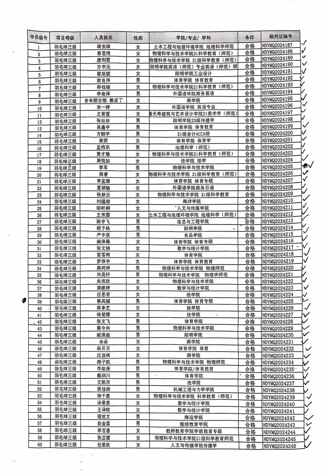 根据国家体育总局《体育竞赛裁判员管理办法》《浙江省体育竞赛裁判员管理实施细则》和《关于浙江省高等学校等级裁判员项目审批管理实施办法》的规定,按照相应项目三级裁判员技术等级标准,完成所授课学时,考试合格,现对蒋安琪等96人拟晋级羽毛球三级裁判员进行公示。公示期为发布之日起 5 个工作日。在公示期内,任何单位和个人均可通过来信、来电、来访的方式反映公示对象情况,信件有效期以邮戳为准。以单位名义反映问题的应加盖公章。以个人名义反映问题的提倡署报本人真实姓名和联系电话。反映问题要坚持实事求是的原则,反对借机诽谤诬告。