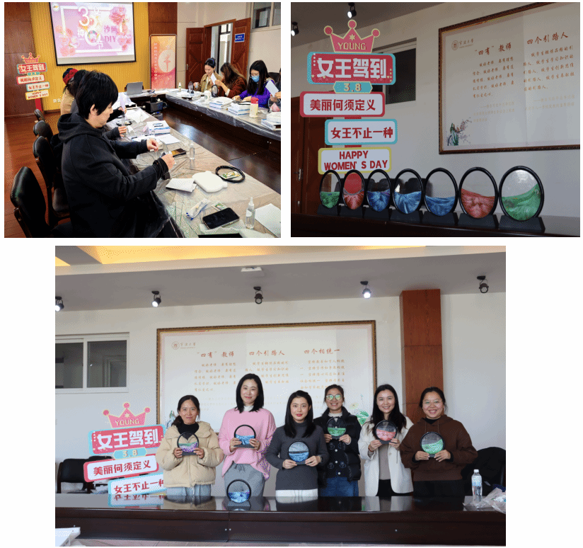 3月8日中午12点,体育学院分工会为纪念三八国际妇女节,联合亚太物业在学院4楼会议室精心组织了一场流沙画DIY活动。流沙画是极具独特和艺术感的活动,不同颜色的沙粒带给作品不同的效果和氛围,蕴含了创作者的情感和浪漫表达。活动伊始,让每位女教师根据制作视频,选择自己喜欢的颜色进行创作。大家信心满满,纷纷动起手来,首先将沙粒倒入圆形的玻璃框内,待全部沙粒缓慢进入之后用胶水将封口封住,静置5-10分钟之后就可以装上外框,静静等待一天之后倒置的惊喜。流沙画DIY活动给女同胞们带来了欢乐,在欢声笑语中绽放自信与浪漫,不仅陶冶情操,也增进了同事之间的友谊,体会 诗情画意般的美好生活。体验流沙画,感受诗意与浪漫的方式庆祝“三八”妇女节,以此来丰富女教师们的文化生活,提升幸福感、获得感,展现巾帼风采。